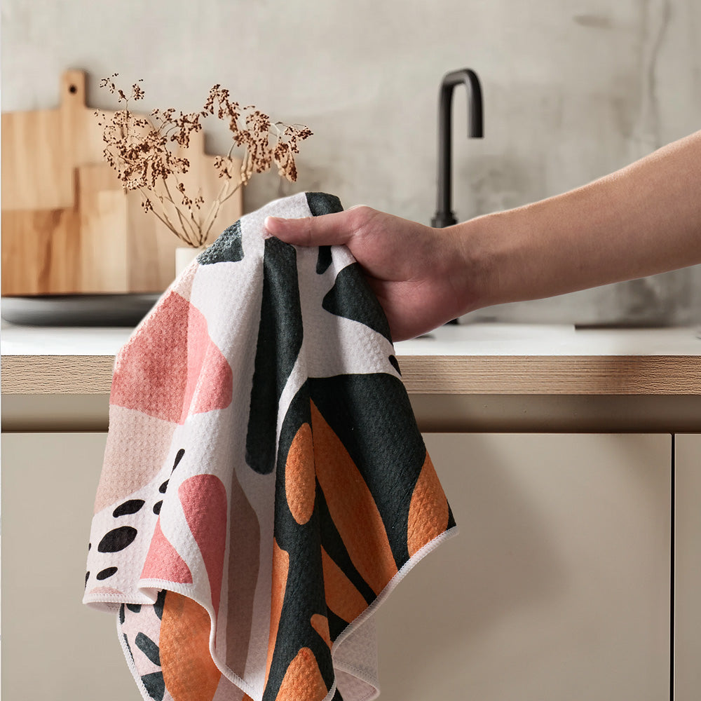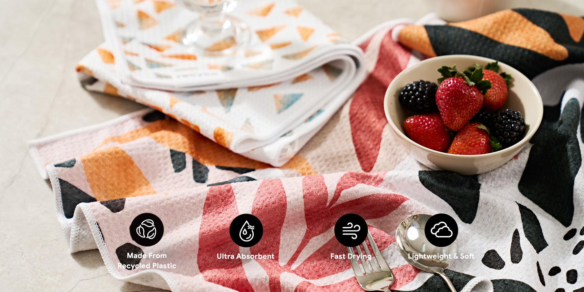 Elevate your kitchen with towels that blend style, functionality, and sustainability. Made from 2 recycled plastic bottles, these ultra-absorbent towels hold up to five times their weight in liquid. Lightweight yet durable, they’re crafted with our premium Aerodry™ microfiber—gentle on hands, tough on messes. With fast-drying capabilities and convenient sewn-in loops, they’re the ultimate choice for a cleaner kitchen and a greener planet.