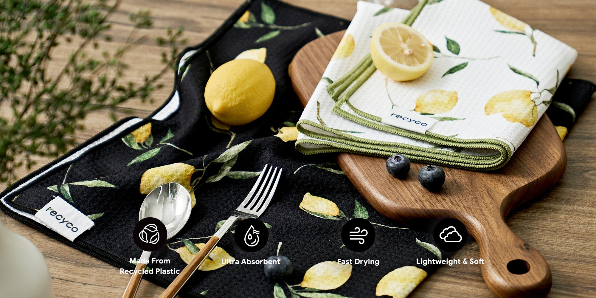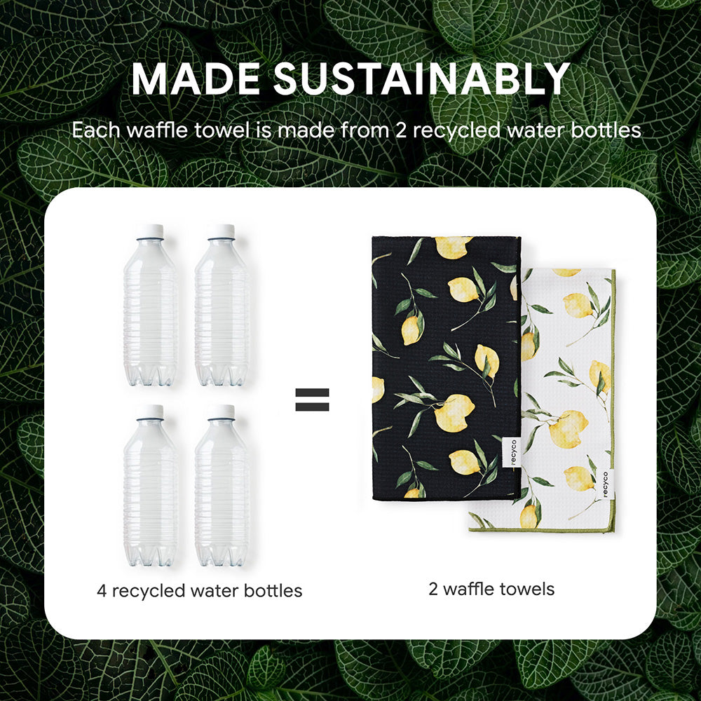 Elevate your kitchen with towels that blend style, functionality, and sustainability. Made from 2 recycled plastic bottles, these ultra-absorbent towels hold up to five times their weight in liquid. Lightweight yet durable, they’re crafted with our premium Aerodry™ microfiber—gentle on hands, tough on messes. With fast-drying capabilities and convenient sewn-in loops, they’re the ultimate choice for a cleaner kitchen and a greener planet.