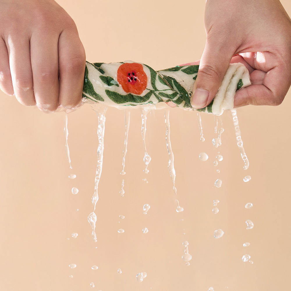 To clean, toss in the washing machine or place on the top rack of the dishwasher. Lay flat to dry. When your Swedish dish cloth has reached the end of its lifecycle (9 months or even more!), toss in the compost.