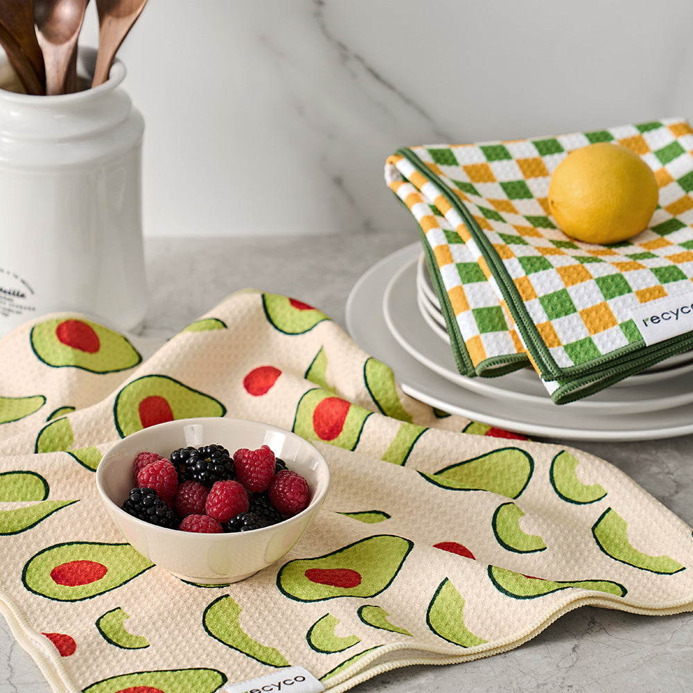 Elevate your kitchen with towels that blend style, functionality, and sustainability. Made from 2 recycled plastic bottles, these ultra-absorbent towels hold up to five times their weight in liquid. Lightweight yet durable, they’re crafted with our premium Aerodry™ microfiber—gentle on hands, tough on messes. With fast-drying capabilities and convenient sewn-in loops, they’re the ultimate choice for a cleaner kitchen and a greener planet.