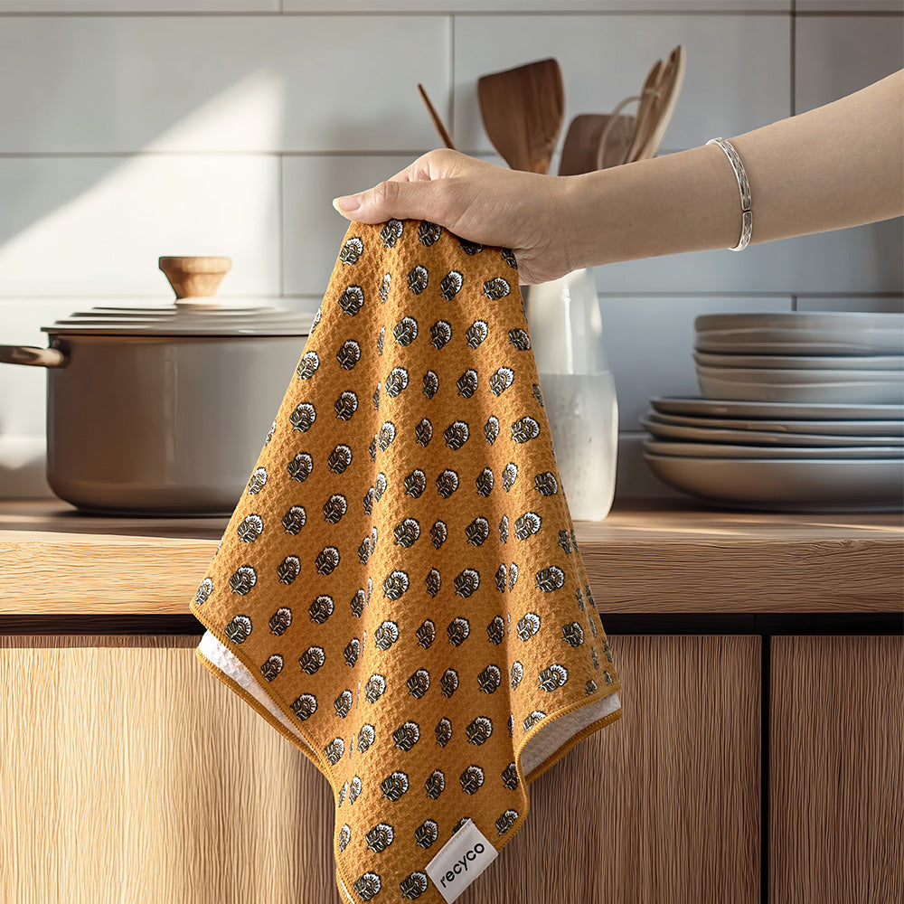 Elevate your kitchen with towels that blend style, functionality, and sustainability. Made from 2 recycled plastic bottles, these ultra-absorbent towels hold up to five times their weight in liquid. Lightweight yet durable, they’re crafted with our premium Aerodry™ microfiber—gentle on hands, tough on messes. With fast-drying capabilities and convenient sewn-in loops, they’re the ultimate choice for a cleaner kitchen and a greener planet.