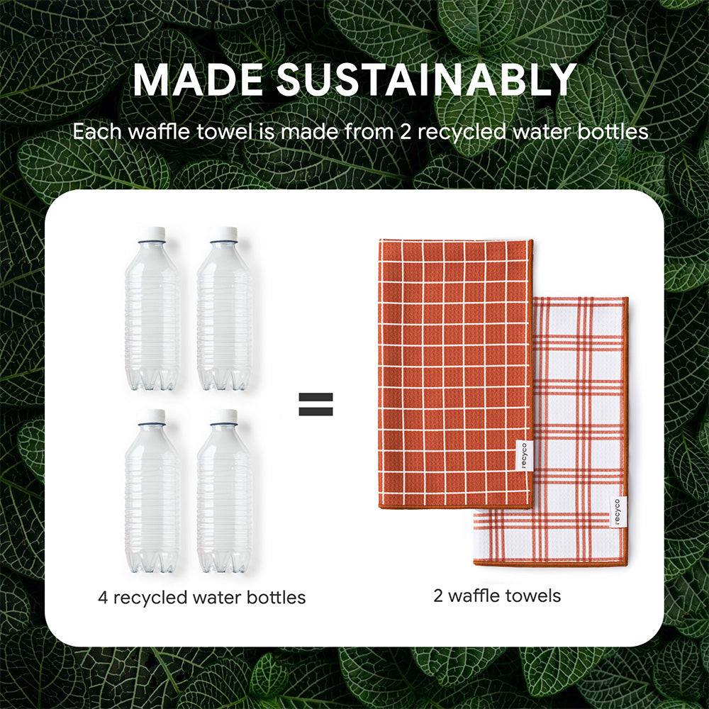 Elevate your kitchen with towels that blend style, functionality, and sustainability. Made from 2 recycled plastic bottles, these ultra-absorbent towels hold up to five times their weight in liquid. Lightweight yet durable, they’re crafted with our premium Aerodry™ microfiber—gentle on hands, tough on messes. With fast-drying capabilities and convenient sewn-in loops, they’re the ultimate choice for a cleaner kitchen and a greener planet.