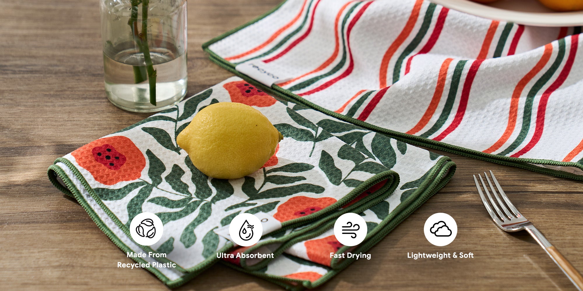 Elevate your kitchen with towels that blend style, functionality, and sustainability. Made from 2 recycled plastic bottles, these ultra-absorbent towels hold up to five times their weight in liquid. Lightweight yet durable, they’re crafted with our premium Aerodry™ microfiber—gentle on hands, tough on messes. With fast-drying capabilities and convenient sewn-in loops, they’re the ultimate choice for a cleaner kitchen and a greener planet.
