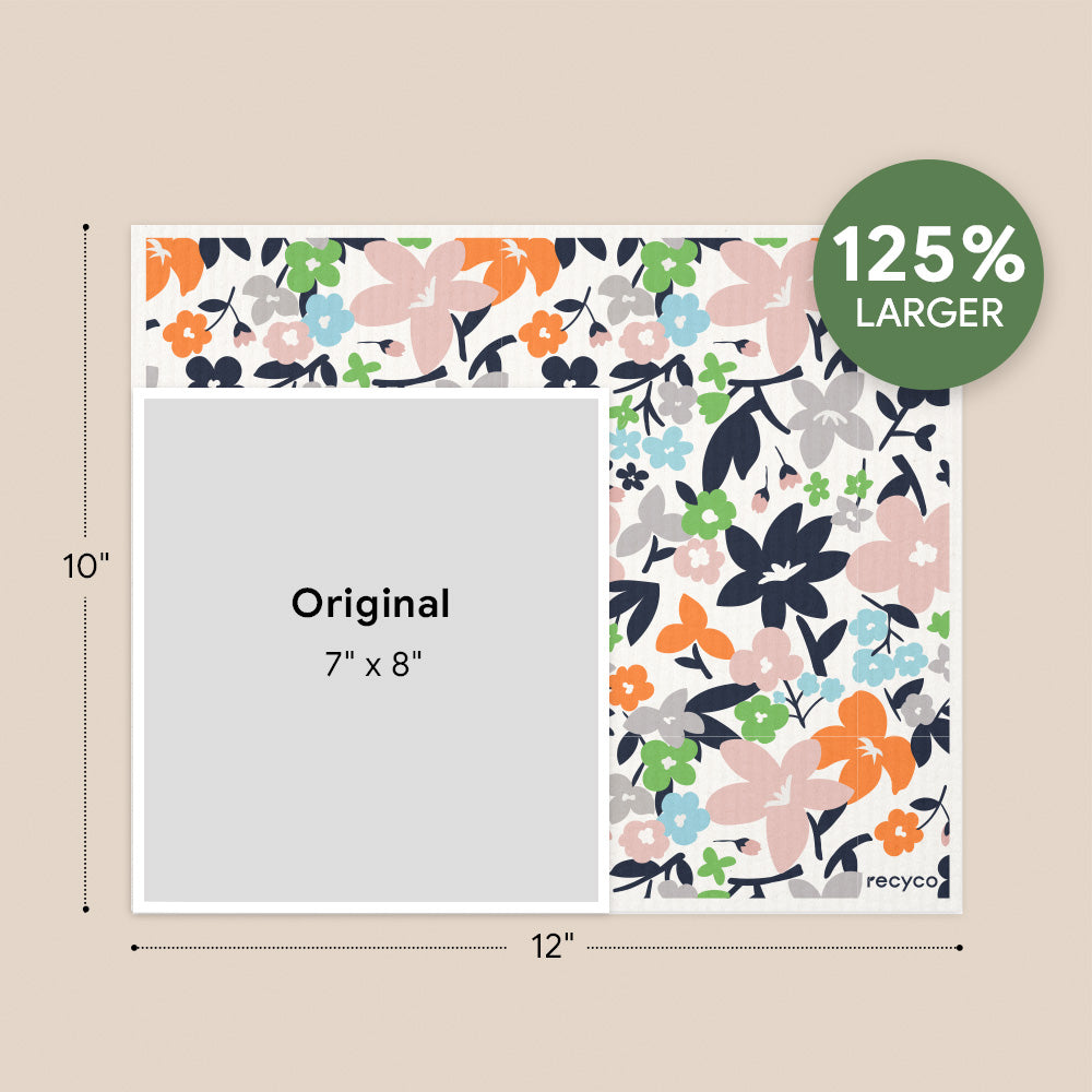 The new Recyco oversized Swedish dishcloth is 10"x12" in size and 125% larger than regular dishcloths in the market. Now you can clean with ease on a larger scale.