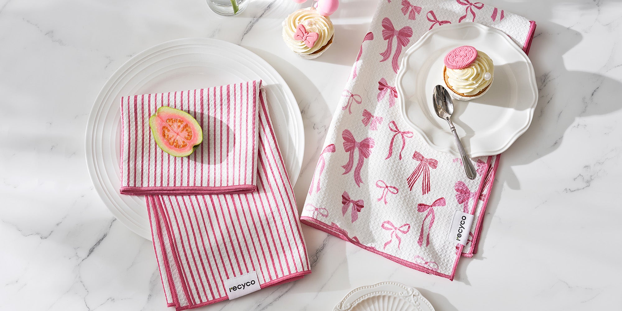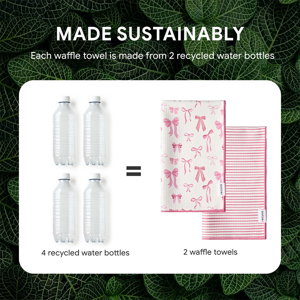 Elevate your kitchen with towels that blend style, functionality, and sustainability. Made from 2 recycled plastic bottles, these ultra-absorbent towels hold up to five times their weight in liquid. Lightweight yet durable, they’re crafted with our premium Aerodry™ microfiber—gentle on hands, tough on messes. With fast-drying capabilities and convenient sewn-in loops, they’re the ultimate choice for a cleaner kitchen and a greener planet.