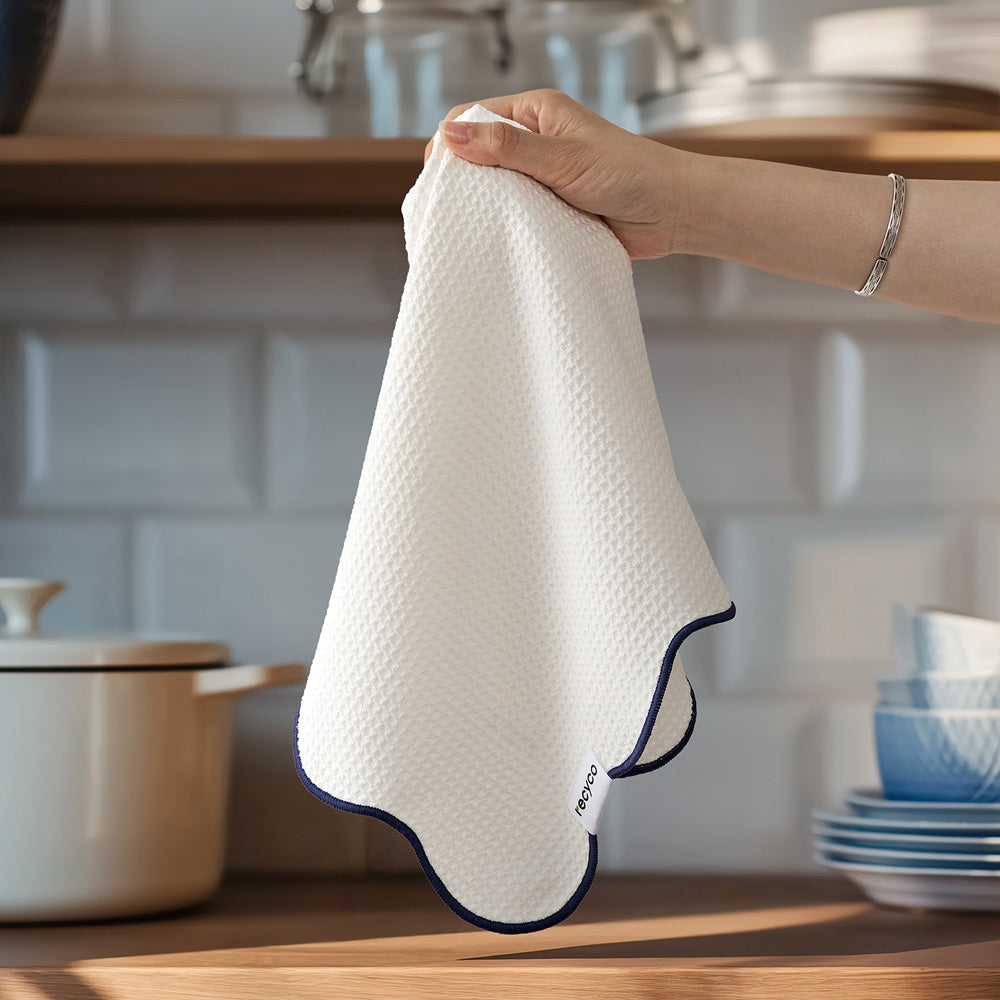 Elevate your kitchen with towels that blend style, functionality, and sustainability. Made from 2 recycled plastic bottles, these ultra-absorbent towels hold up to five times their weight in liquid. Lightweight yet durable, they’re crafted with our premium Aerodry™ microfiber—gentle on hands, tough on messes. With fast-drying capabilities and convenient sewn-in loops, they’re the ultimate choice for a cleaner kitchen and a greener planet.