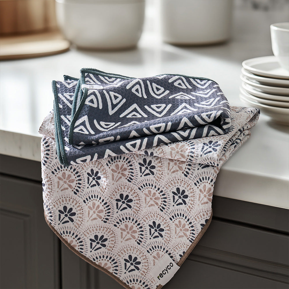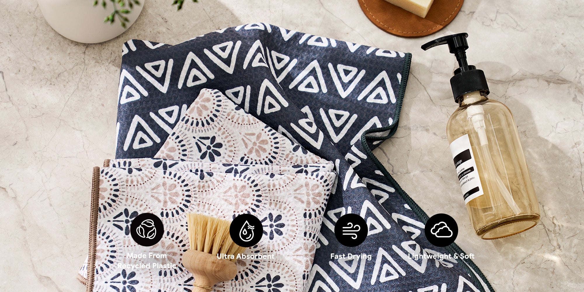 Elevate your kitchen with towels that blend style, functionality, and sustainability. Made from 2 recycled plastic bottles, these ultra-absorbent towels hold up to five times their weight in liquid. Lightweight yet durable, they’re crafted with our premium Aerodry™ microfiber—gentle on hands, tough on messes. With fast-drying capabilities and convenient sewn-in loops, they’re the ultimate choice for a cleaner kitchen and a greener planet.